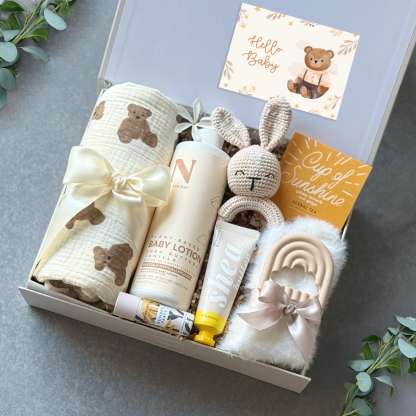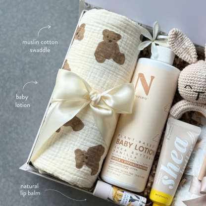A sweet, calming gift for mom and baby��includes a soft swaddle, bunny rattle, fluffy socks, herbal tea, and gentle care items for moments of rest and connection.