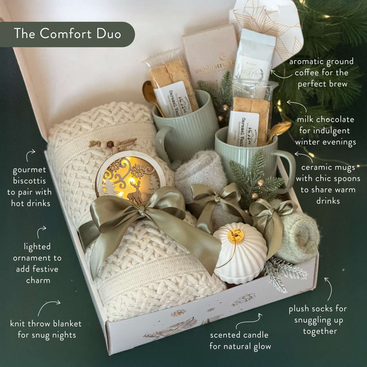 Celebrate warmth, comfort, and connection with the The Comfort Duo Gift Box �� a beautifully curated collection designed for cozy shared moments. Perfect for couples, families, or close friends, this elegant holiday set combines artisan flavors, soft textures, and glowing accents to create an unforgettable winter experience. Inside, you��ll find two ribbed ceramic mugs with matching gold spoons, rich ground coffee, crisp biscotti, and smooth milk chocolate. A chunky knit throw and plush socks add layers of comfort, while golden LED ornaments and a gold-and-white ceramic candle bring a touch of festive glow. Thoughtfully finished with satin ribbons and greenery, it��s the perfect way to share warmth and joy this holiday season.